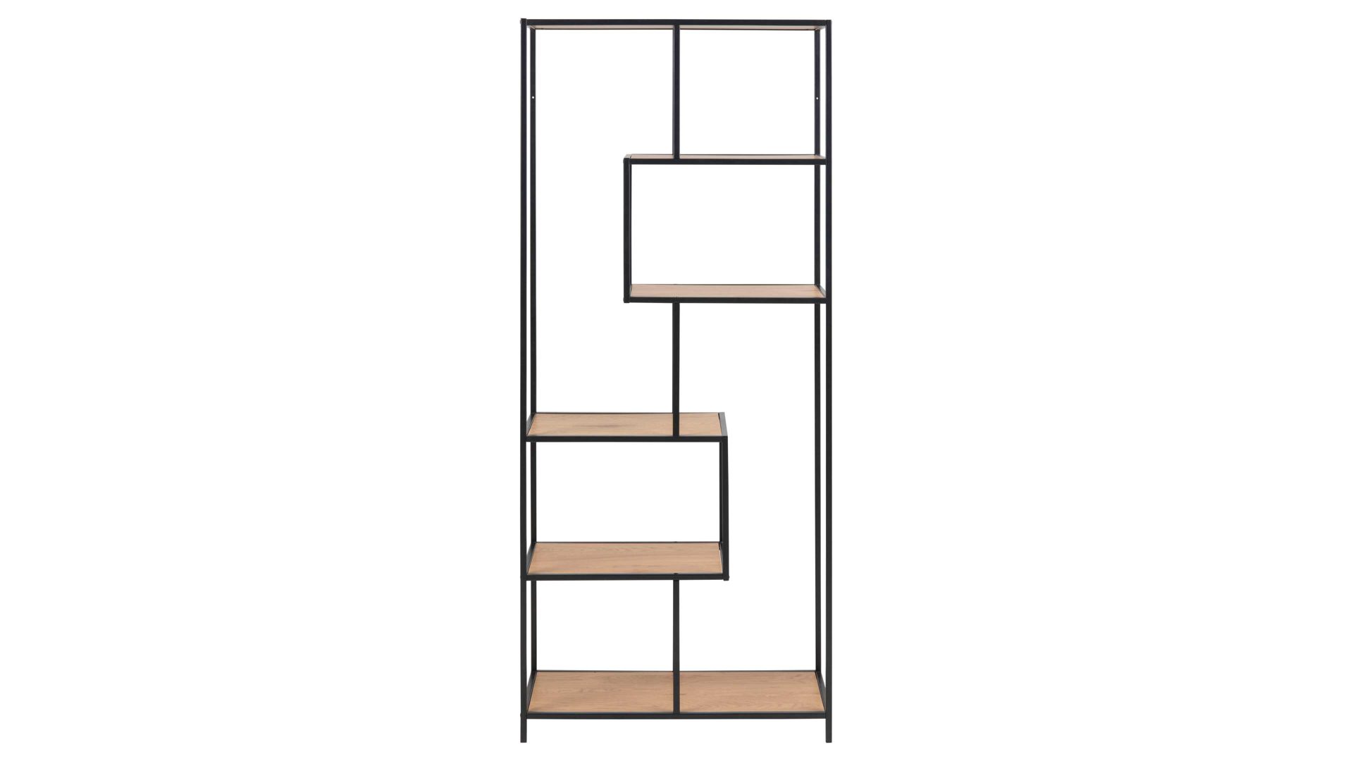 Ein robustes Finish bekommt das Standregal durch das schwarz pulverbeschichtete Stahlgestell mit rauer Oberfläche. Die asymmetrische Aufteilung des vielseitig einsetzbaren Kleinmöbels unterstreicht den zeitgemäßen und aufregenden Look des Bücherregals. Mit geräumigen Maßen von ca. 77 x 185 x 35 cm (BxHxT) passt das Regal optimal in viele Wohnkonzepte.