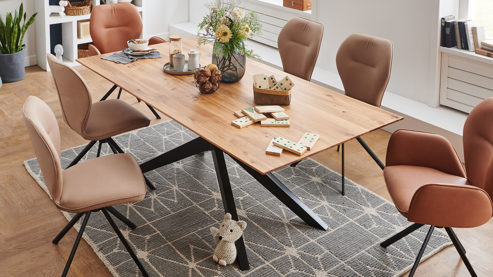 Der NIEHOFF Massivholz-Esstisch Cloudy zeichnet sich durch hohe Qualität sowie moderne Designmerkmale aus. Er kombiniert ein markantes, klassisch mattschwarz lackiertes Sterngestell aus robustem Eisen mit einer Massivholzplatte aus Charakter-Eiche und fügt sich in verschiedene Wohnstile harmonisch ein.