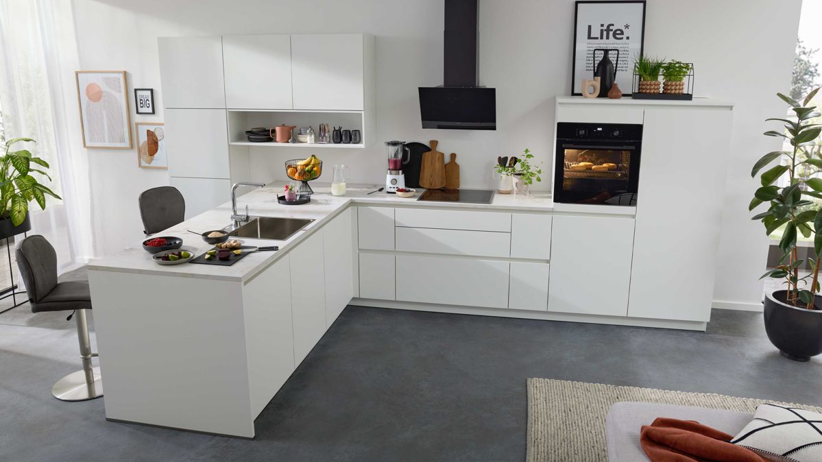Die Interliving Küche Serie 3089 kombiniert klare Linien, hochwertige Materialien und viel Stauraum auf ca. 480 cm Länge inklusive Hängeschränken und ca. 220 cm Tiefe. Mattweiße Melaminfronten, weiße Korpusse und Arbeitsplatten in Marmor Bianco Nachbildung erzeugen einen hellen, modernen Look.