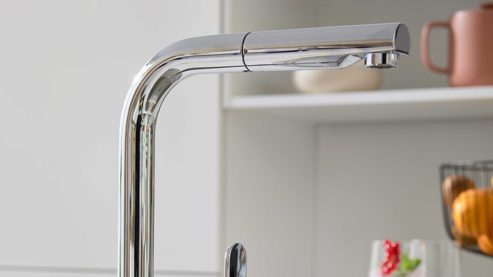 Hier findest du Hängeschränke mit grifflosen Fronten sowie ein offenes Regal für Dekoratives oder Alltägliches. Die übertiefe Arbeitsplatte lässt sich ideal auch als Tresen nutzen. Ein hochwertiges Edelstahlbecken und eine verchromte Einhand-Mischbatterie machen den Bereich komplett.