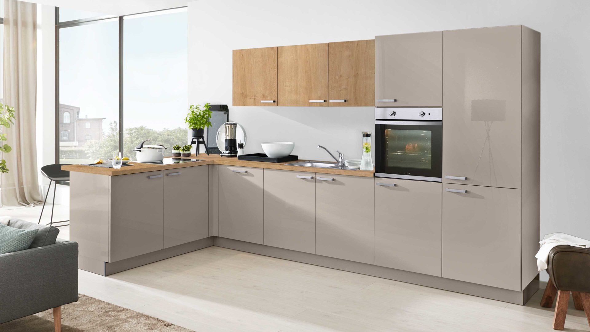 Die Interliving Küche Serie 3052 vereint edlen Hochglanz mit natürlicher Ausstrahlung. Ihre lavafarbenen Hochglanzfronten, Korpusse und Sockelblenden wirken modern und stilvoll, während die Chalet Eiche-Nachbildung bei Arbeitsplatten und Akzenten für warme Kontraste sorgt. Abgerundet wird das Design durch praktische Metall-Bügelgriffe, die das Gesamtbild funktional und elegant ergänzen.