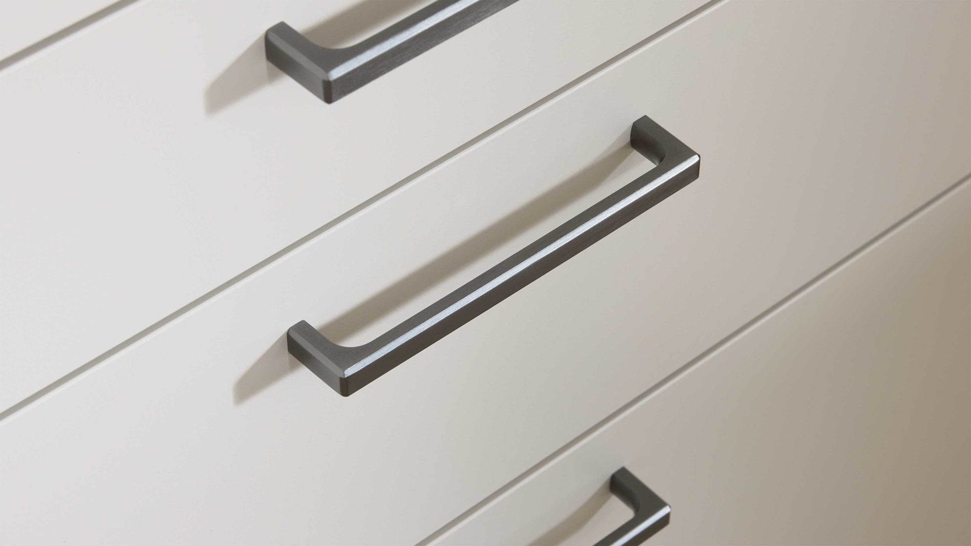 Muschelweiß, kombiniert mit Victoria Nussbaum-Nachbildung und graphitfarbenen Bügelgriffen