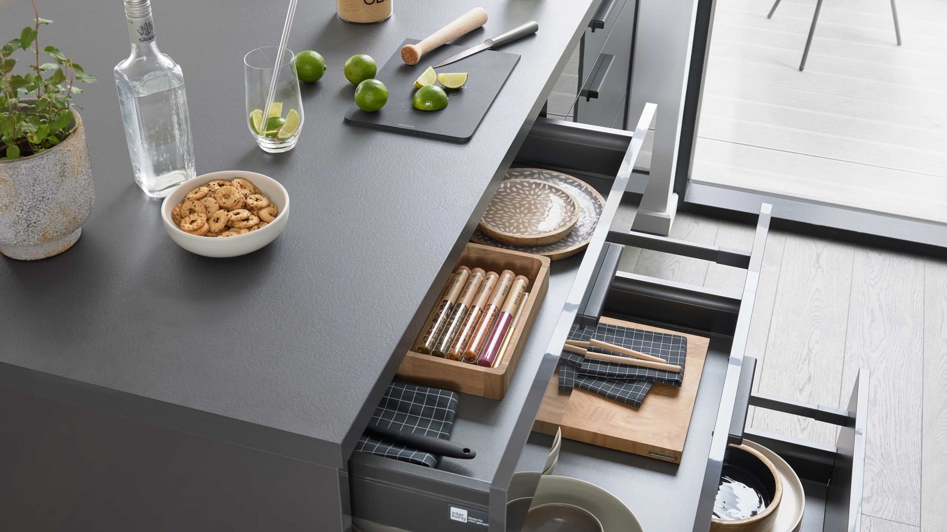 • Die Abbildung zeigt ein Wohnbeispiel, welches auch Dekoration sowie separat erhältliches Zubehör enthält. Im Lieferumfang enthalten sind eine Kücheninsel und eine Hochschranklösung.