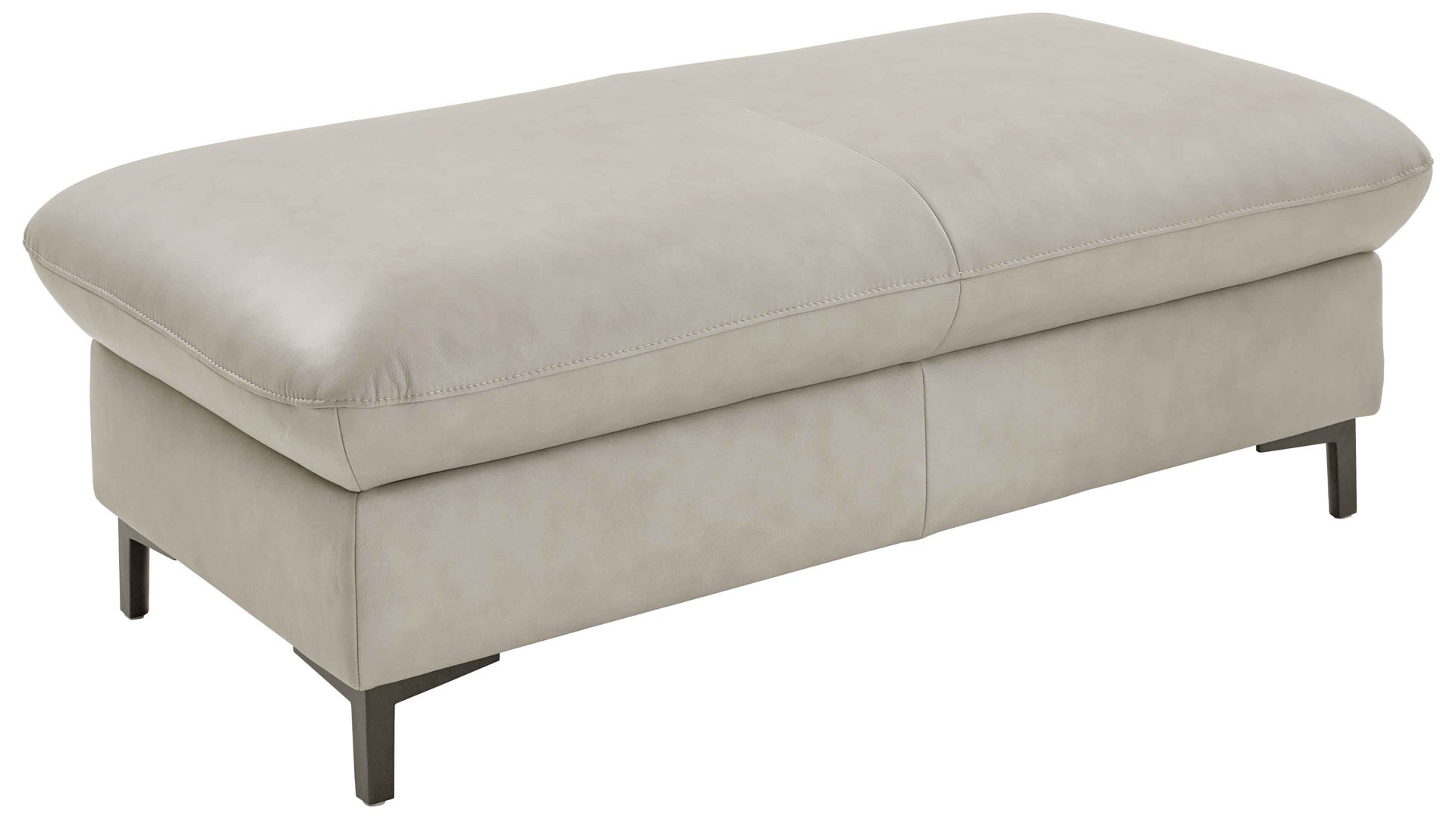 Der XXL-Hocker aus der Modulmaster-Polsterserie MM-PN1161 kombiniert aluminiumfarbenes LongLife-Leder mit mattschwarzen Metall-Winkelfüßen. Er strahlt moderne Eleganz aus.