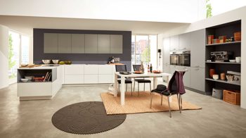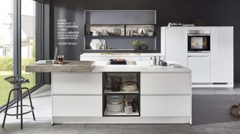 Die nolte® Einbauküche Feel kombiniert softmatte arcticweiße und schwarze Lacklaminatfronten mit Korpussen in denselben Tönen, weißen Sockelblenden sowie schwarzen Arbeitsplatten und einem betonfarbenen Thekentisch. Durch die klassischen Farbnuancen strahlt die Systemküche puristische Eleganz aus. Akzentuierend wirkt die grifflose Frontgestaltung.
