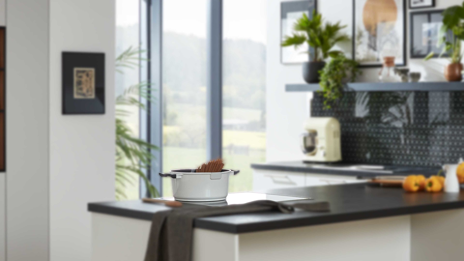 Auf der gegenüberliegenden Seite sorgt eine übertiefe Arbeitsplatte mit dem AEG Glaskeramik-Kochfeld HD6460XB für großzügige Koch- und Vorbereitungsflächen.