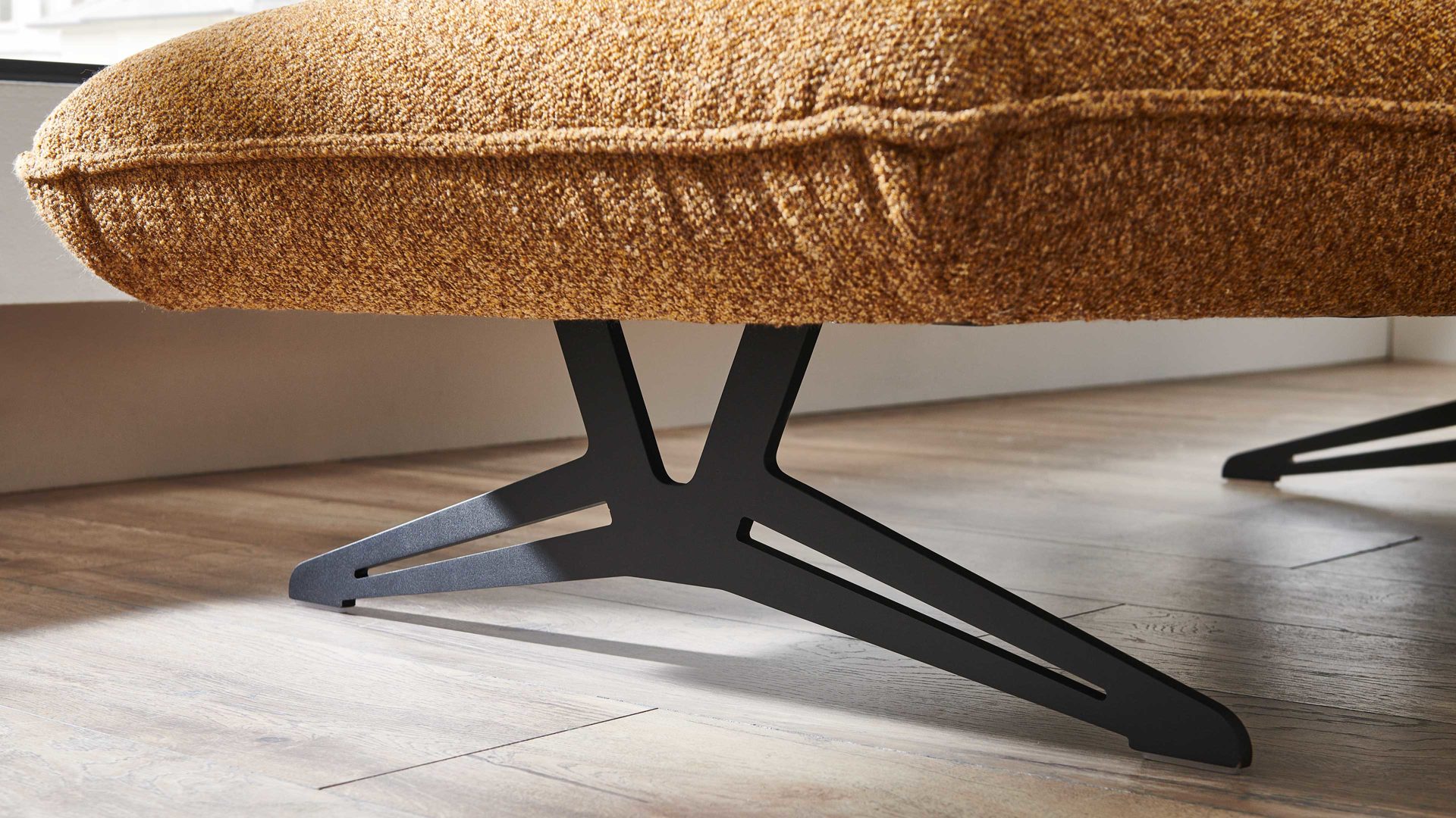 Mit seinen mattschwarzen Metallkufen verleiht es jedem Raum eine moderne und stilvolle Note. Es besteht aus einer schrägen mittelgroßen Liege mit Armteil links und einem mittelgroßen Element Armteil rechts.
