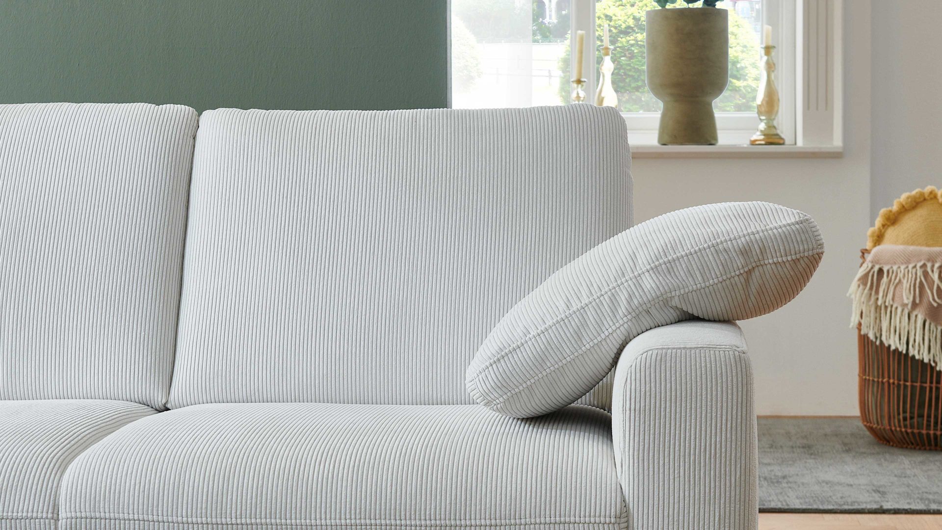 Auf ihm können Sie Ihren Arm extra bequem ablegen - oder Sie verwenden es als komfortables Kopfkissen, wenn Sie hin und wieder einen erholsamen Powernap auf der Couch halten. Mit dem naturweißen Feincordbezug harmoniert das Kissen perfekt mit den Sofas im gleichen Design. Seine Maße belaufen sich auf ca. 45 x 50 cm (BxL).