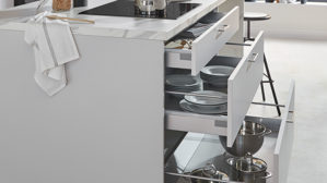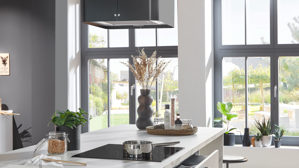 Kombination aus einer Kochinsel und einer Küchenzeile mit viel Stauraum