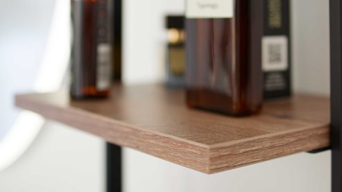 Für zusätzlichen Stauraum und dekorative Akzente sorgen zwei stilvolle Regale mit mattschwarz pulverbeschichtetem Stahlrahmen und Böden in Vikings Oak Nachbildung. Das große Regal (Typ 49457-010-205) verfügt über vier feste Böden mit jeweils ca. 28 x 1,6 x 21 cm (B/LxHxT) und misst insgesamt ca. 30 x 130 x 28 cm (BxHxT). Das kleinere Regal (Typ 49455-010-205) bietet drei feste Böden in denselben Maßen und misst ca. 30 x 72 x 28 cm (BxHxT). Beide Regale ergänzen das Badezimmermöbel-Set perfekt und bringen Leichtigkeit und Struktur ins Bad.