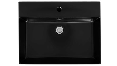 Dazu passt der mattschwarze Keramik-Aufsatzwaschtisch (Typ 87756), der durch seine edle, pflegeleichte Oberfläche und klare Formensprache besticht. Er ist mit einer Hahnlochbohrung und einem Überlauf ausgestattet und misst ca. 60 x 12 x 46 cm (B/LxHxT).