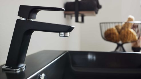 Die Armatur (Typ 17718) kombiniert mattschwarzes und verchromtes Metall zu einem modernen, hochwertigen Gesamtbild. Sie verfügt über eine Zugstangen-Ablaufgarnitur, flexible Anschlussschläuche und Anschlüsse für Warm- und Kaltwasser. Der integrierte Luftsprudler (24 mm Durchmesser) sorgt für einen gleichmäßigen Wasserstrahl. Für eine Hahnlochbohrung von 35 mm Durchmesser und mit Maßen von ca. 12 x 15 cm (BxH) bietet sie Bedienkomfort und Langlebigkeit.