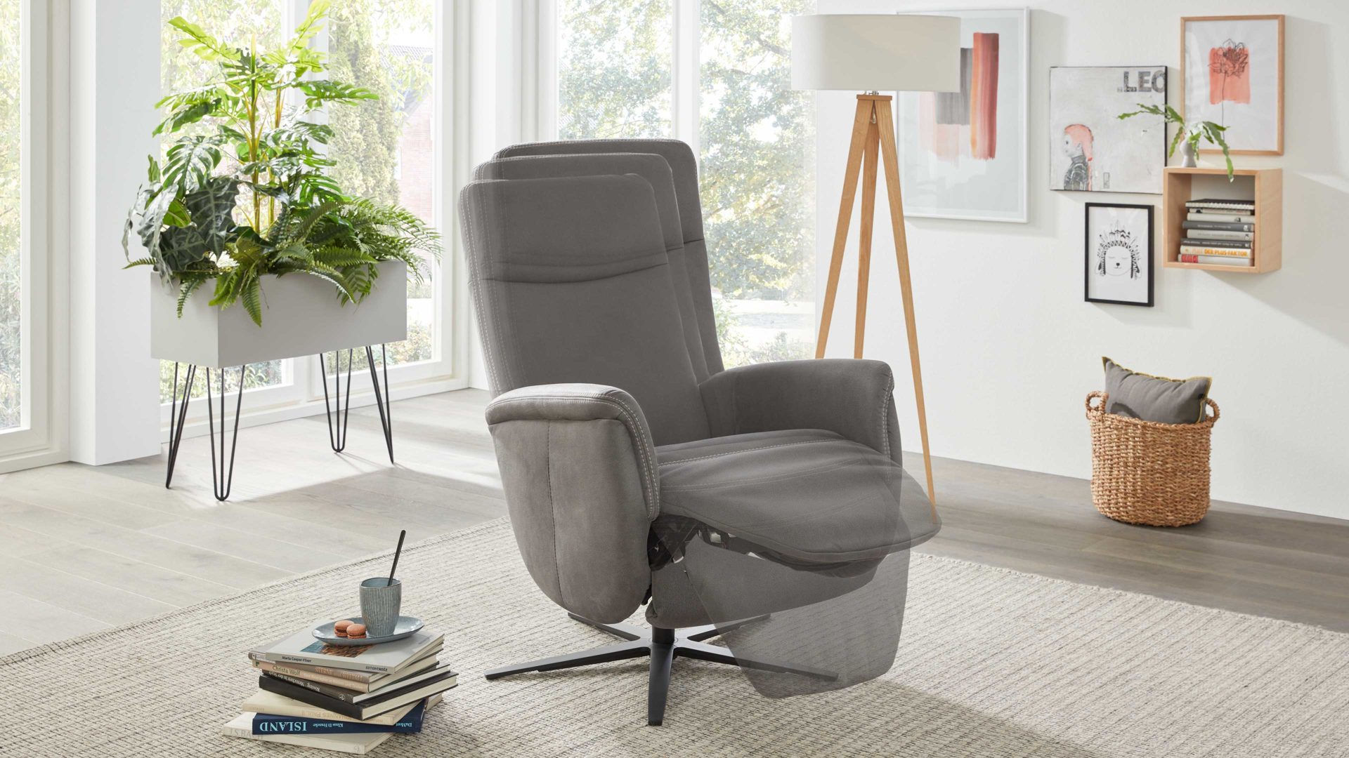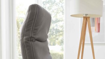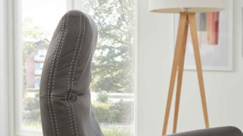 Das Highlight des Sessels bildet die manuelle Relaxfunktion: Leichter Körperdruck führt dazu, dass sich der Rücken senkt. Dabei geht der Sitz automatisch nach vorn und oben. Parallel fährt die Beinauflage nach oben bis in die Relaxposition. Zudem begeistern das stufenlos verstellbare Kopfteil und die Drehbarkeit um 360 Grad.