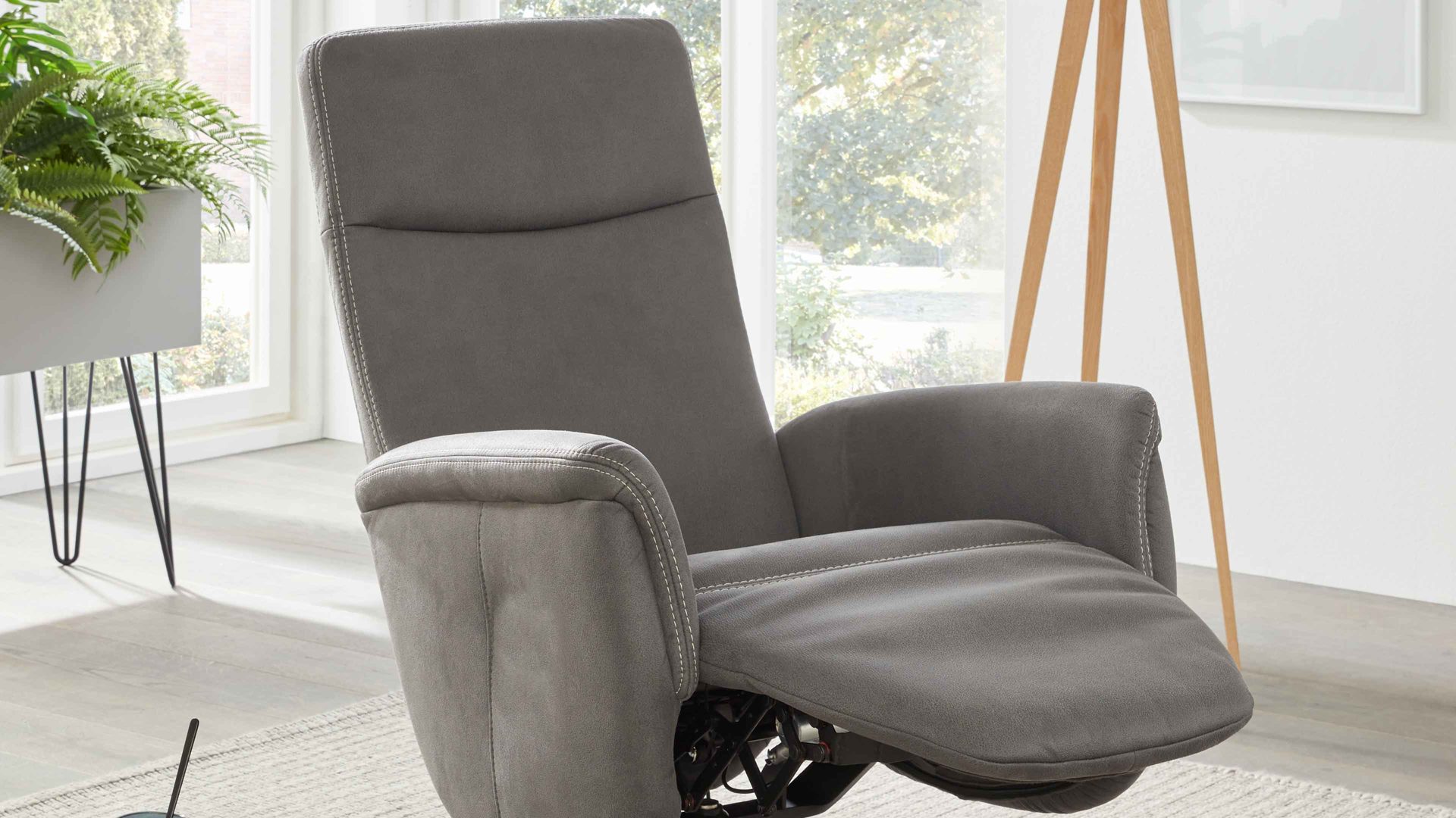 Der attraktive Relaxsessel 1DRF aus dem Modulmaster-Programm MM-ZE1062 ist stilvoll designt und überaus komfortabel. Durch den markanten anthrazitfarbenen Stoffbezug mit beigefarbener Doppelsteppnaht und den mattschwarzen Aluminium-Sternfuß strahlt er moderne Eleganz aus.