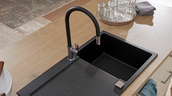 Mit den Einbaugeräten von SIEMENS bist du bestens ausgestattet: ein autarkes Glaskeramik-Kochfeld ET645HE17, die leistungsstarke Dunstabzugshaube LB75564 (ca. 94 cm breit, Energieeffizienzklasse B, Spektrum A+++ bis D), der Backofen HB510ABR1 (Energieeffizienzklasse A, Spektrum A+++ bis D) und der Kühlschrank KI21RNSE0 (Energieeffizienzklasse E, Spektrum A bis G) machen dir das Kochen und Backen leicht. Ein optisches Highlight setzt die mattschwarze Spüle, die mit ihrem modernen Look sofort ins Auge fällt.