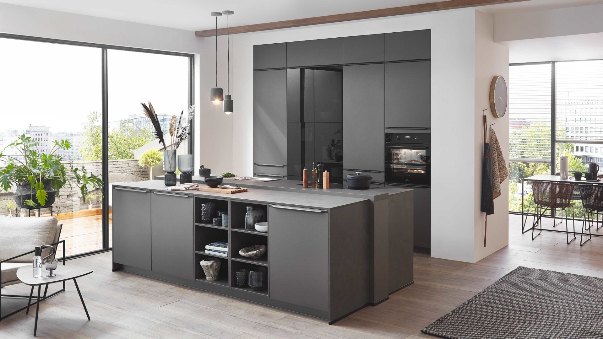 Die nobilia® Einbauküche Laser kombiniert mattes Vulkangrau als absolute Trendfarbe mit attraktiven Akzenten aus Schwarzglas.