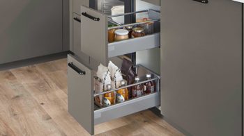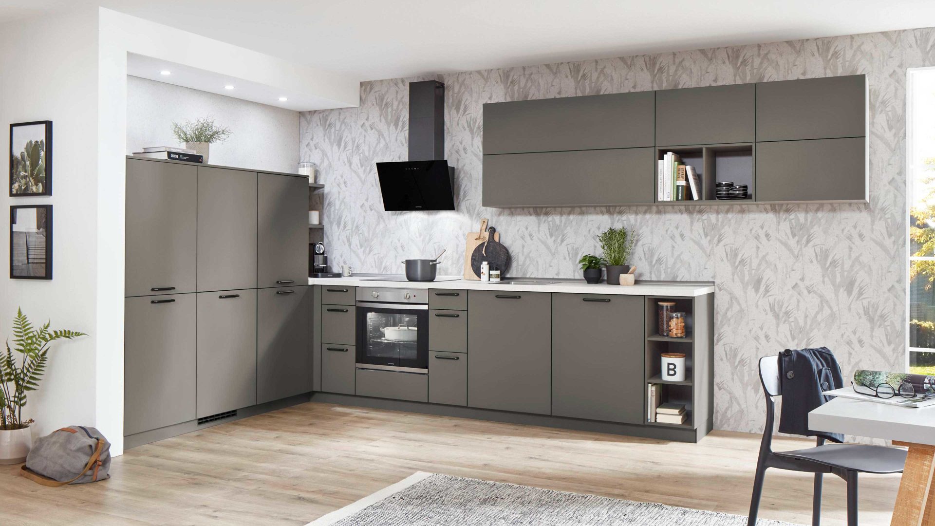 Die nobilia® Einbauküche Laser präsentiert sich in mattem Taupegrau und überzeugt mit einer ruhigen, eleganten Ausstrahlung. Gebürstete anthrazitfarbene Metallgriffe setzen dezente, moderne Akzente. Die Arbeitsplatten in weißer Terrazzo-Nachbildung bringen Frische ins Design und sorgen für einen spannenden, hochwertigen Kontrast.