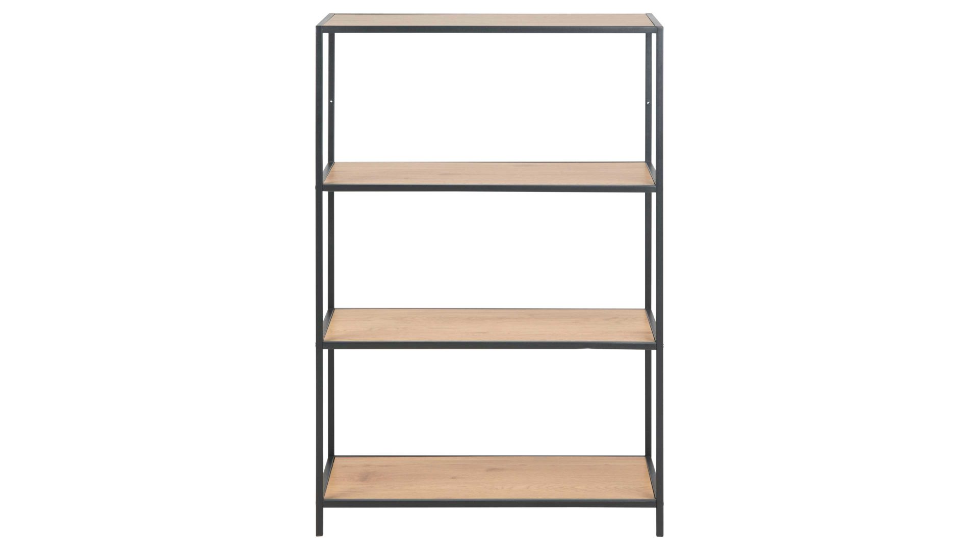 Die Regalböden in Wildeiche-Nachbildung verleihen dem Standregal ein modernes Aussehen. Sein schwarz pulverbeschichtetes Stahlgestell mit rauer Oberfläche rundet das auffällige Design des Wohnzimmermöbels optimal ab. Auf zwei großzügigen Böden und in vier verschieden großen Fächern findet alles Platz, was Sie immer im Blick haben möchten.
