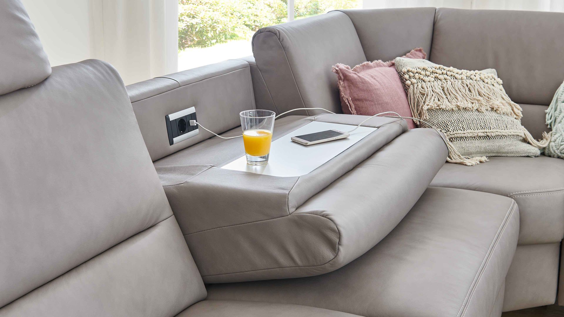 Besonders vorteilhaft sind die integrierte Steckdose und der USB-Anschluss. Diese Extras ermöglichen Ihnen beispielsweise das Aufladen Ihres Smartphones oder Notebooks, während Sie auf dem Sofa sitzend arbeiten oder relaxen. Die Farbe der Ablage entspricht stets der Fußfarbe des jeweiligen Polstermöbels.