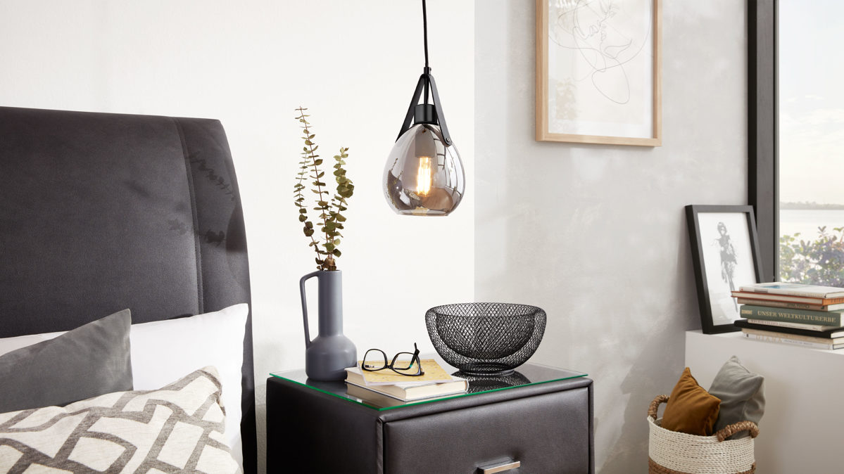 Die Hängeleuchte aus der Interliving Leuchten Serie 9332 verbindet klassisch mattschwarzes Metall mit einem stilvollen Lampenschirm aus verspiegeltem, rauchfarbenem Glas und schwarzem Kunstleder. Diese außergewöhnliche Materialkombination verleiht der Leuchte ihren modernen, leicht futuristischen Charakter mit einem Hauch von Industrial-Stil – ein echtes Highlight für stilbewusste Wohnräume.