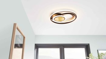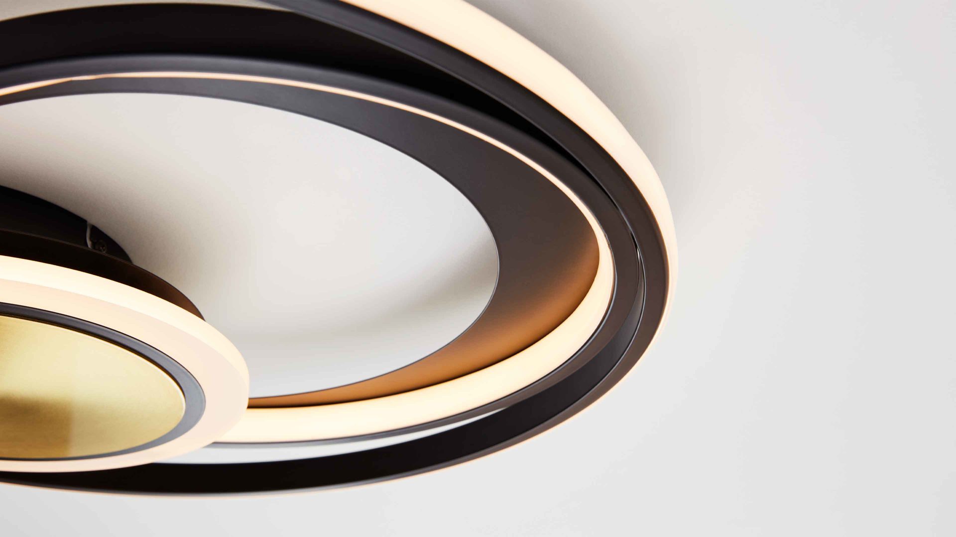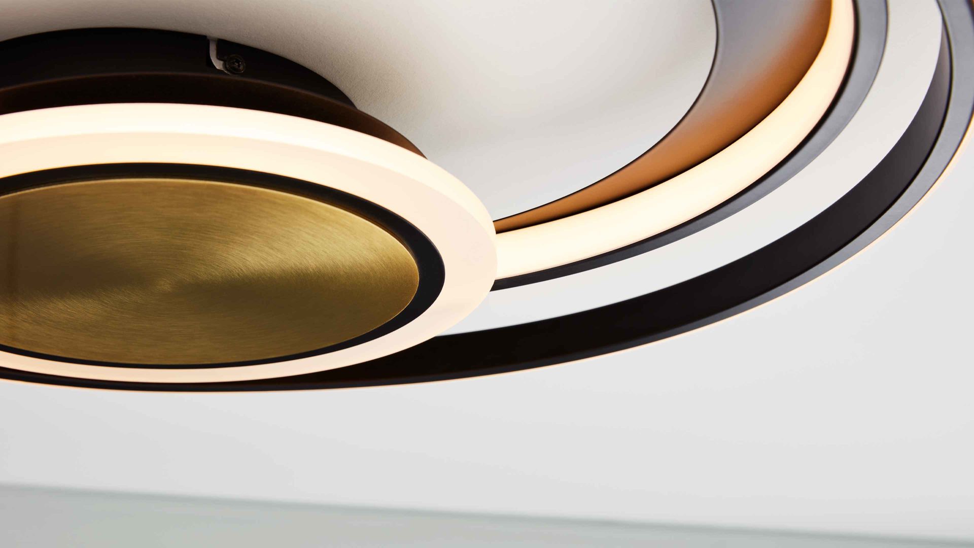 Die Deckenleuchte aus der Interliving Leuchten Serie 9329 begeistert mit ihrem außergewöhnlichen Design, das moderne Formen und edle Farben stilvoll miteinander verbindet. Das Zusammenspiel aus klassisch mattschwarzem Metall, matter Messing-Nachbildung und opalfarbenen Acrylabdeckungen verleiht der Leuchte ihren elegant-futuristischen Charakter – ein echter Blickfang für Wohn- und Schlafräume.