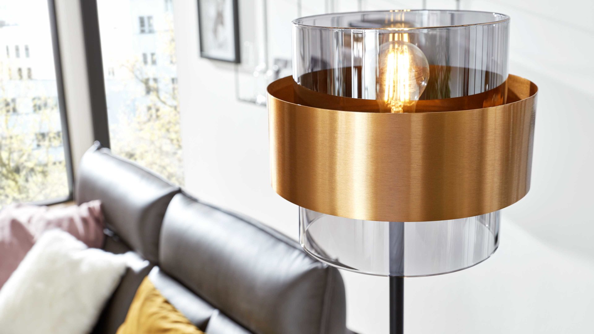 Die Stehleuchte aus der Interliving Leuchten Serie 9333 vereint modernes Design mit raffinierten Details und bringt stilvolle Atmosphäre in dein Zuhause. Das schlanke Gestell aus klassisch mattschwarzem Metall trifft auf einen rauchfarbenen Glasschirm, der von einem gebürsteten messingfarbenen Metallring eingefasst ist. Dieses edle Zusammenspiel aus Materialien und Farben verleiht der Lampe ihren charaktervollen Look – perfekt für Wohn-, Schlaf- oder Arbeitszimmer.
