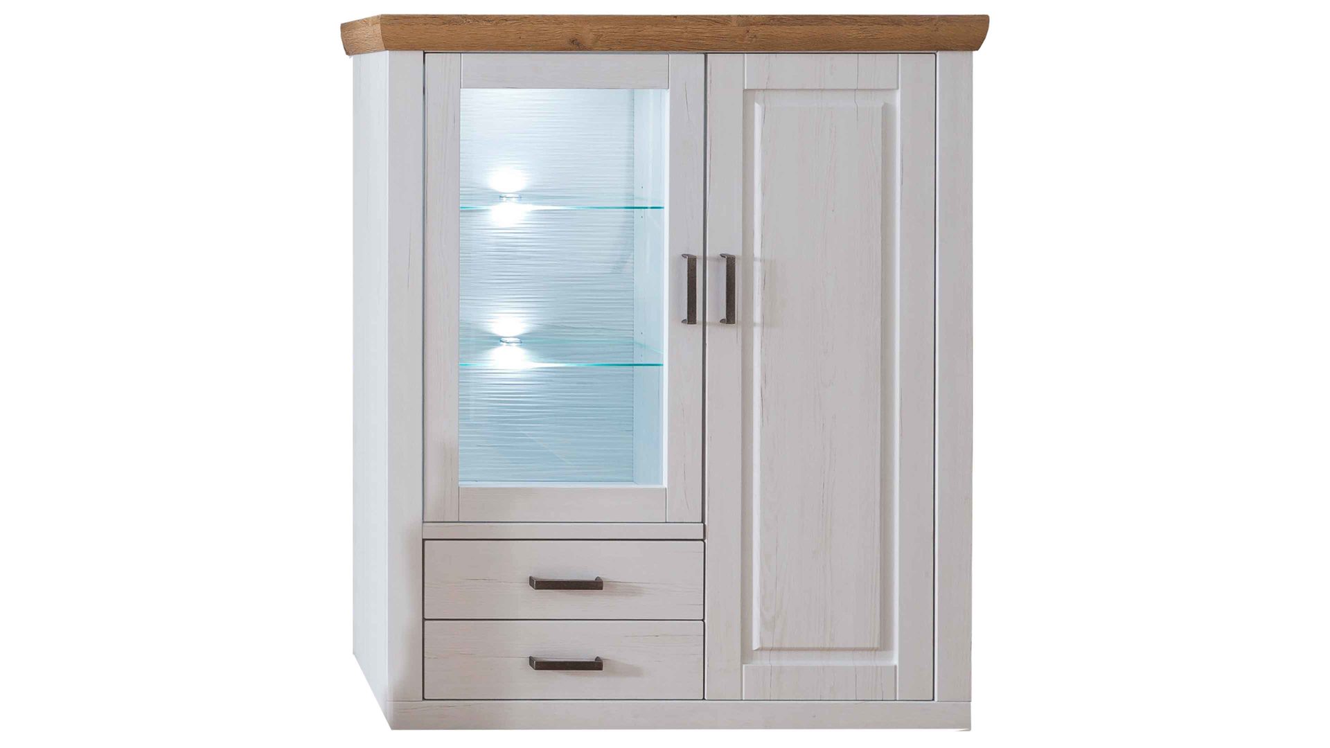 Beim Highboard 21 aus dem Wohnprogramm Brixen begeistern sowohl die optischen als auch die funktionalen Merkmale. Es kombiniert Pinie Aurelio-Nachbildung mit Grandson Oak-Nachbildung. Durch die Farben und die spezielle Frontgestaltung erscheint das Wohnmöbel im angesagten skandinavischen Landhausstil. Eine geschroppte Rückwand, die ebenfalls in Pinie Aurelio-Nachbildung gehalten ist, sorgt zusammen mit dem Klarglaseinsatz für weitere herausragende Akzente. Klassische Metallgriffe runden das ausdrucksstarke Design stilvoll ab.