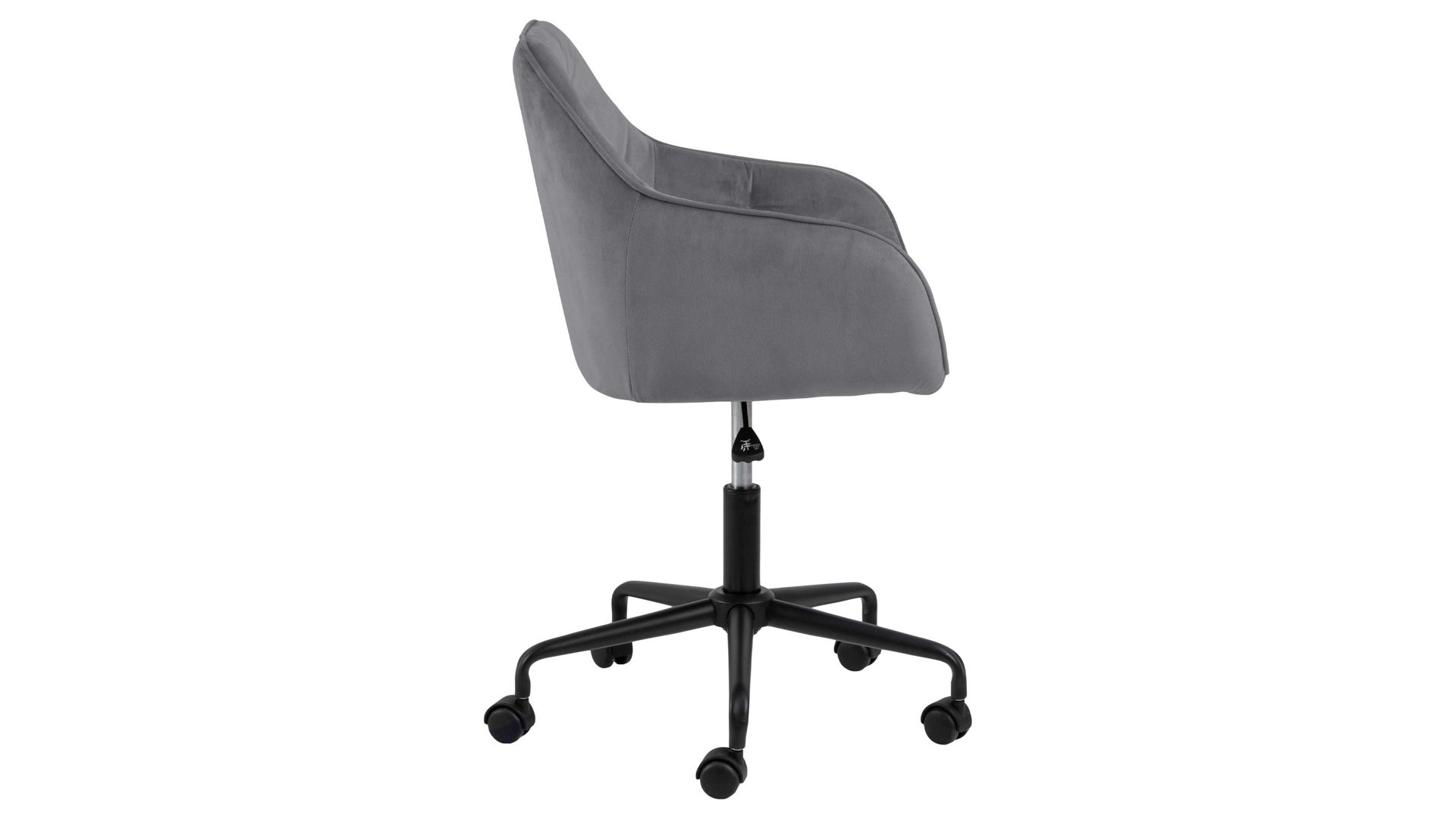 Dabei harmoniert der Drehstuhl in seiner sanften Formensprache mit zahlreichen Einrichtungsstilen: Dafür sorgt der dunkelgraue Samtbezug, der die gesamte Sitzschale inklusive der bequemen Armlehnen weich umhüllt. Das pulverbeschichtete Metall-Drehkreuz fließt in mattem Schwarz stimmig in das Gesamtbild ein.
