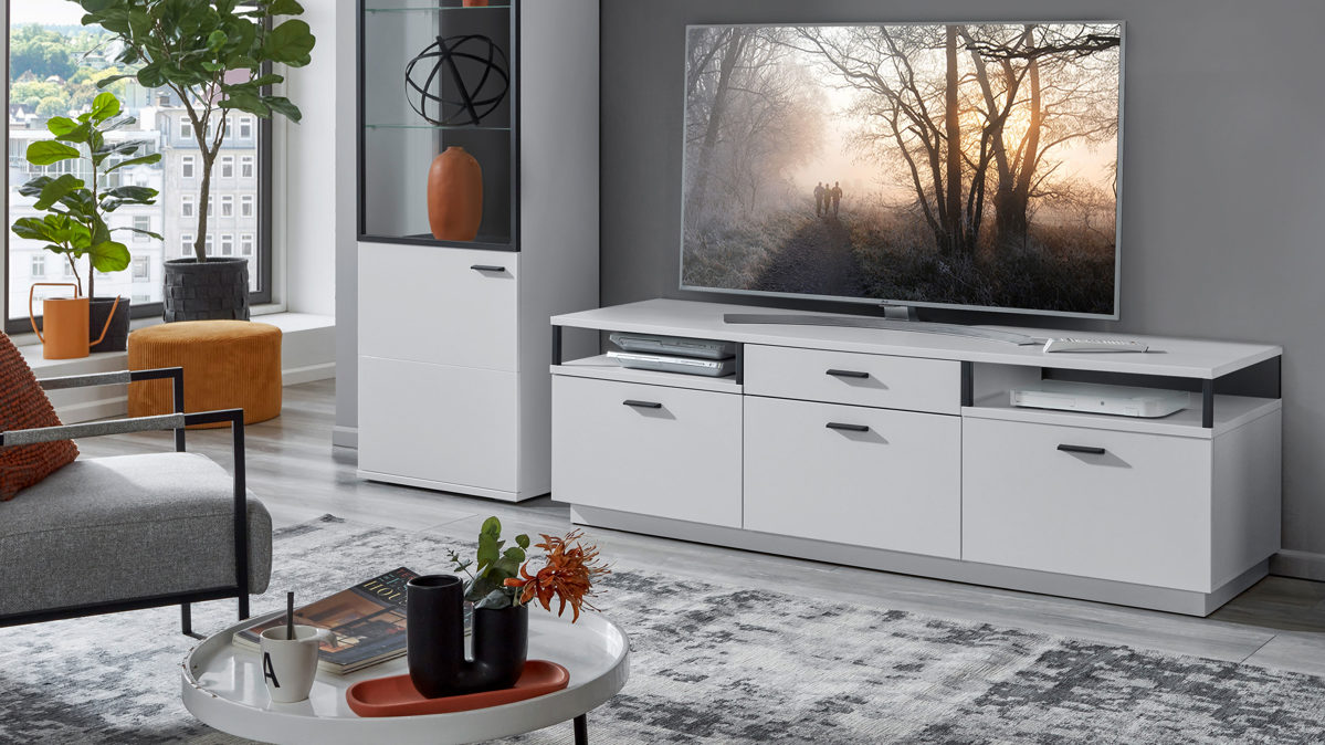 dreitüriges Lowboard mit einer Schublade und zwei offenen Fächern