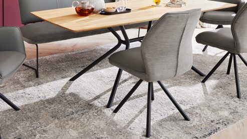 Achte bei der Auswahl deiner Essgruppe auf ausreichend Bewegungsfreiheit rund um den Tisch und kombiniere Materialien bewusst, um spannende Kontraste zu schaffen. Der Mix aus Leder und Cord wirkt besonders modern und bringt gleichzeitig Wärme in den Raum.