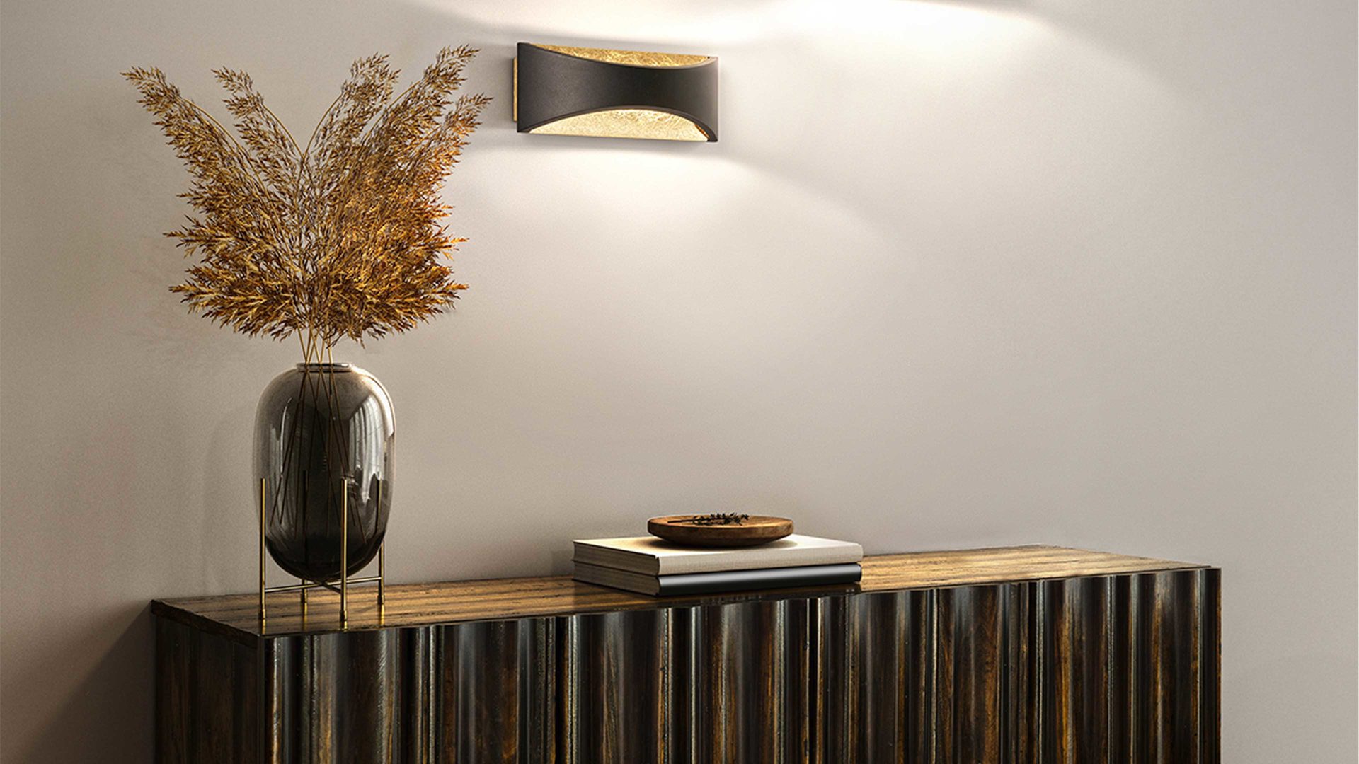 blattgoldfarbenes Metall, kombiniert mit matt sandschwarzem Metall und weißem Acrylglas