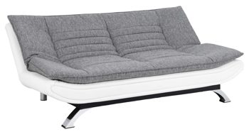 Das Schlafsofa Faith beeindruckt mit seinem modernen, eleganten Design sowie der Funktionalität, die es zu einem vielseitigen Polstermöbel macht. Für die nötige Standstabilität sorgen verchromte Metallfüße. Die Kombination des hellgrauen Stoff- mit dem weißen Kunstlederbezug wirkt besonders edel und fühlt sich angenehm an. Einen gelungenen Akzent setzt die Quersteppung der Sitz- und Rückenfläche. Der Rücken der Couch ist mit schwarzem Nesselstoff bezogen.