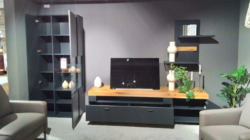Das Möbelspektrum reicht von einem Low-, einem Side- und einem Highboard über eine Vitrine und ein Wandregal bis hin zu einem Couch- und einem Funktionsesstisch. Sämtliche Elemente kommen im gleichen Design daher, sodass Sie Ihr Wohnzimmer einheitlich einrichten können.