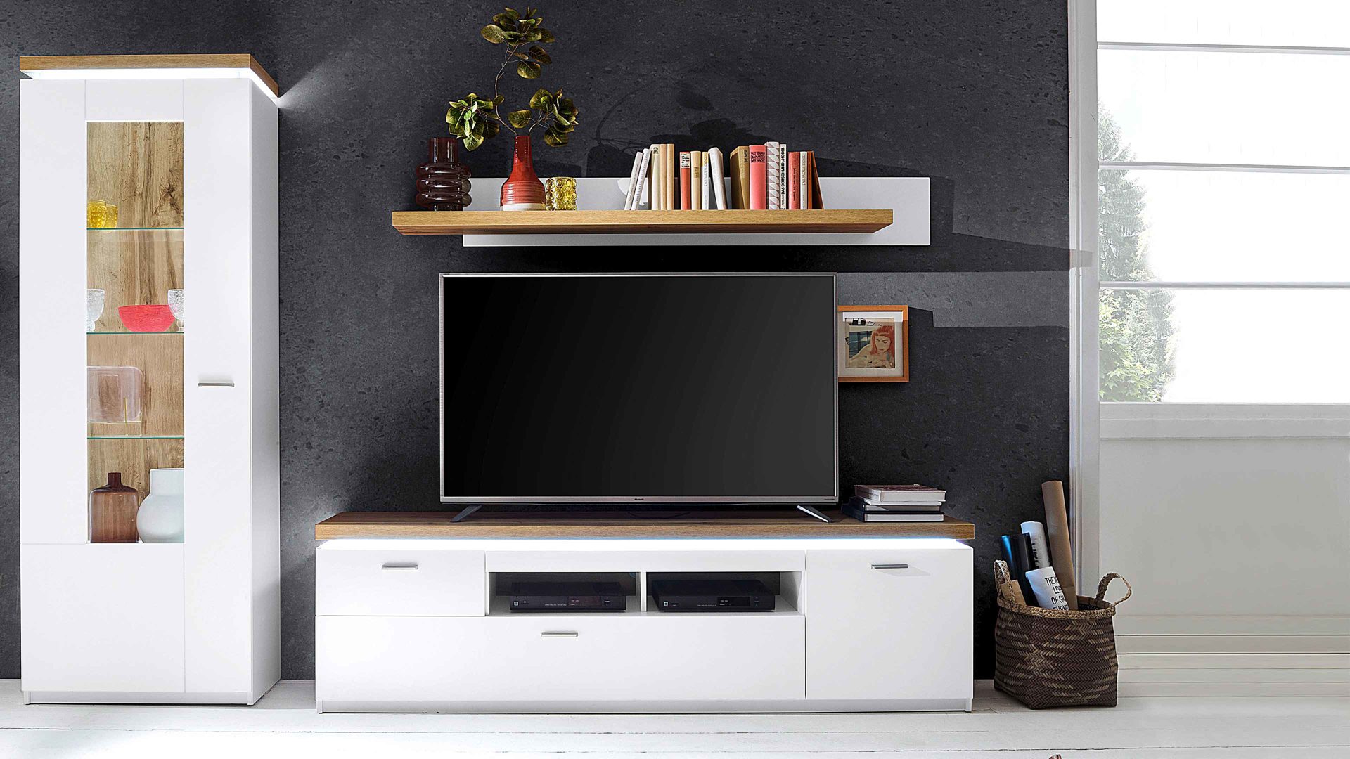 Die Gesamtmaße der Wohnwand 01 liegen bei ca. 280 x 198 x 44 cm (BxHxT). Highlights bilden die Dämpfung der Schubladen für lautloses Schließen und die Deckboden-Beleuchtung mit fest verbauten LED-Leuchtmitteln, die bereits inklusive ist und optisch wie funktional begeistert. Gegen Aufpreis lässt sich die Wohnkombination mit einer zusätzlichen LED-Beleuchtung und Funkfernbedienung ergänzen.