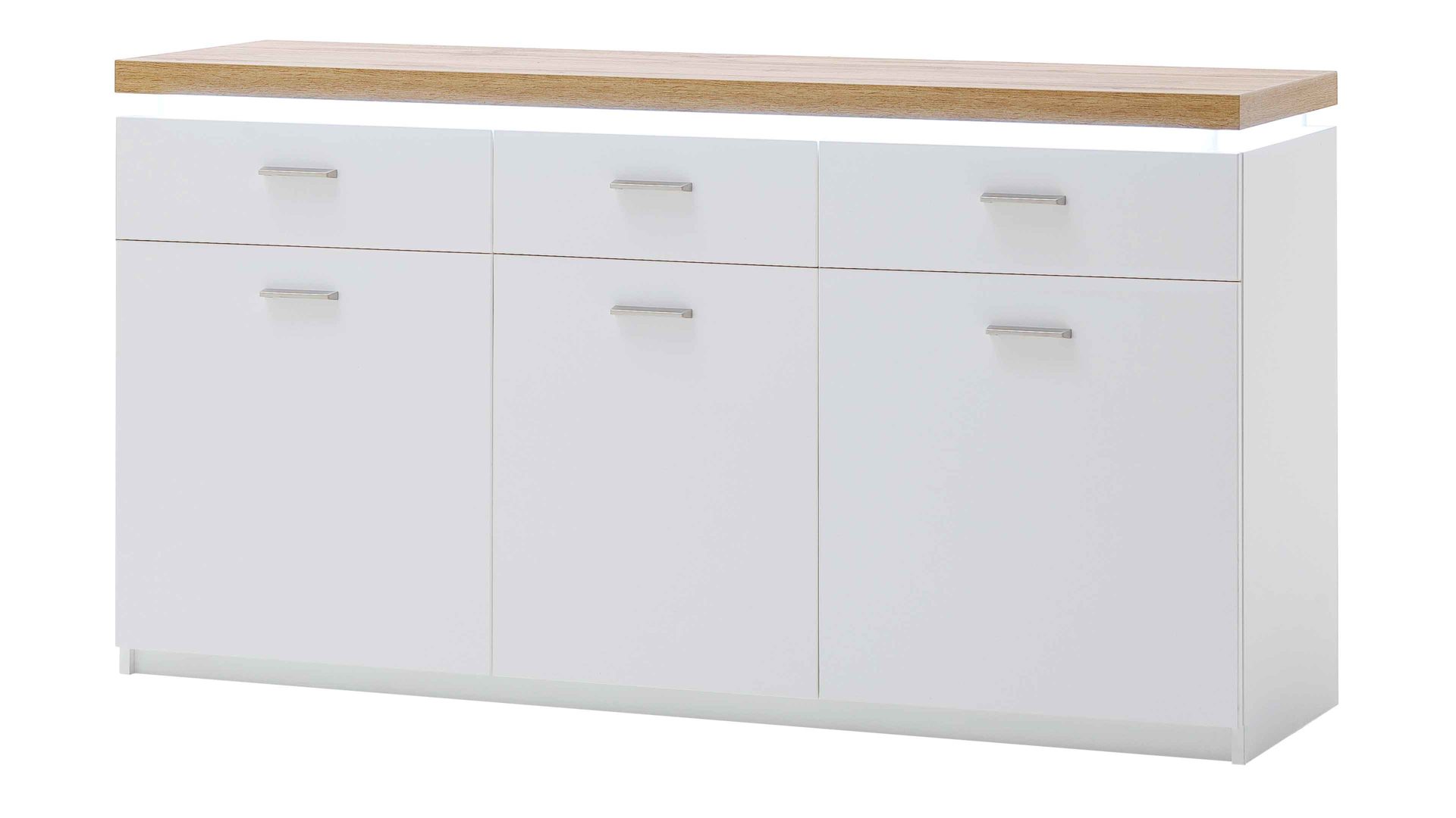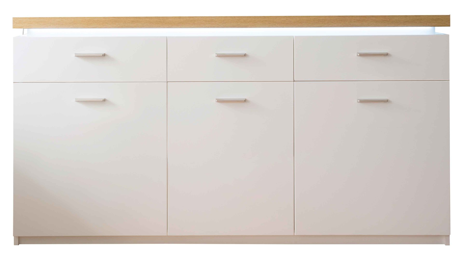 Das Sideboard 01 aus dem modernen Wohnprogramm Cali verbindet kratz- und stoßfeste, weiße Melaminoberflächen mit Wotan Eiche-Nachbildung - und dadurch puristische Eleganz mit natürlich anmutendem Charme. Robuste Metallgriffe runden die stilvolle Kommode mit Maßen von ca. 156 x 83 x 44 cm (BxHxT) stimmig ab.
