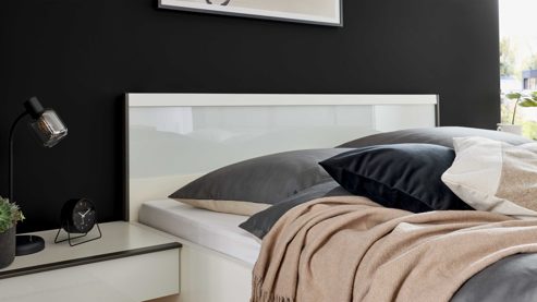 Auch bei den Bettvarianten genießt du volle Flexibilität: Doppelbettgestelle sind in Breiten von 180 bis 200 cm und vier Längen erhältlich. Das Kopfteil gibt es alternativ auch gepolstert, und bei den Füßen kannst du zwischen einem schmalen Winkelfuß oder einem Quersockel wählen. Nachtkonsolen (je 60 cm breit) mit 1 oder 3 Auszügen, auf Wunsch mit LED-Aufsatzpaneel, sowie fertig montierte Beimöbel runden das vielseitige Programm ab.