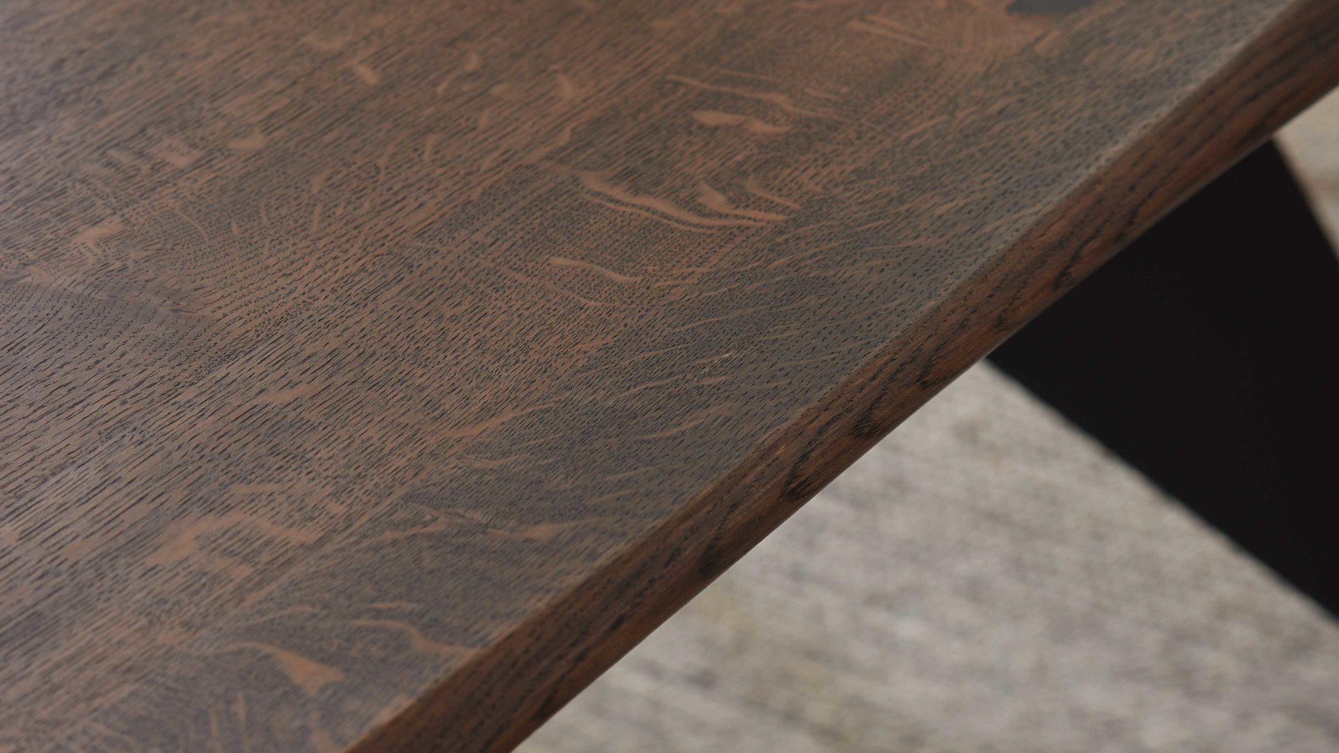 Besonderer Hingucker ist das robuste Gestell aus kreativ geformtem, schwarzem Stahl, das dem Tisch eine architektonisch anmutende Basis verleiht. Die Kombination aus dunkler Eiche und kühlem Metall sorgt für spannende Kontraste und verleiht deinem Wohnbereich einen urbanen Charakter.