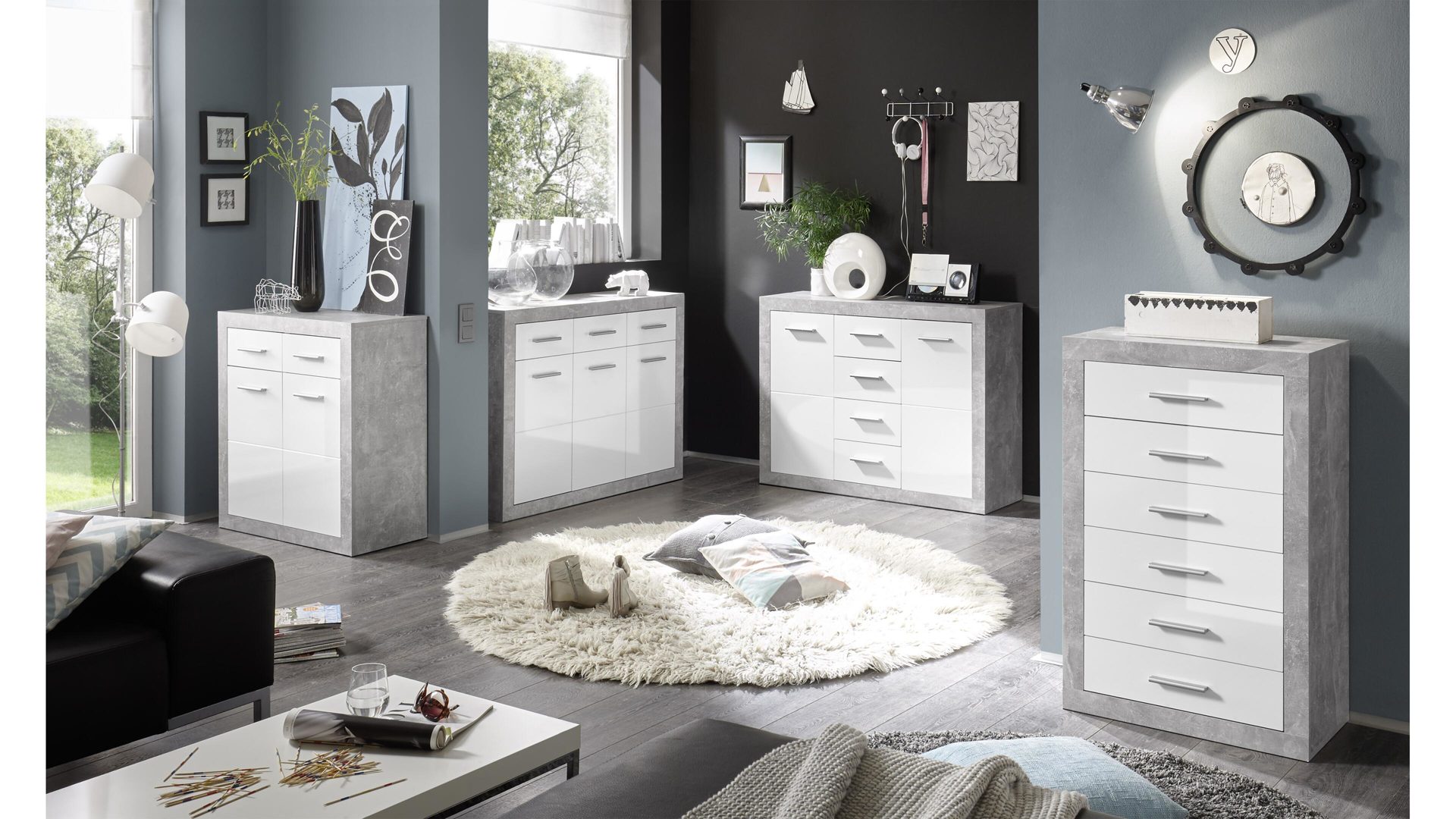 Beim qualitativ hochwertig verarbeiteten Medienmöbel Stone fügen sich spezielle optische Merkmale und eine ausgeklügelte Funktionalität zu einem rundum überzeugenden Ganzen zusammen. Das TV-Lowboard ist in Beton-Nachbildung kombiniert mit strahlend weißen Hochglanzoberflächen gestaltet und strahlt in dieser außergewöhnlichen Farbgebung eine Menge Eleganz aus. Akzente setzen die chromfarbenen Griffe. Sie harmonieren exzellent mit den beiden dominierenden Tönen.