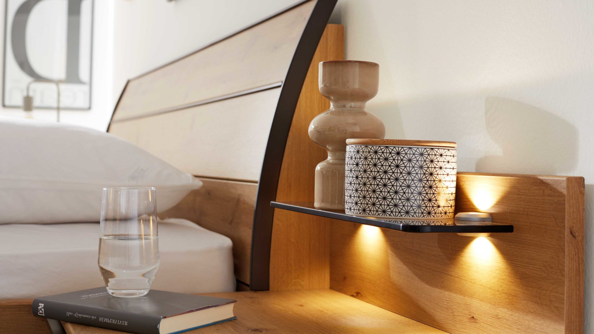 Natürlich & modern zugleich: Die Kombination aus Bianco Eiche Nachbildung und einer edlen Rauchglasablage sorgt für warme, zeitgemäße Leichtigkeit. Das Paneel harmoniert perfekt mit weiteren Möbeln der Serie 1205 und fügt sich nahtlos in unterschiedliche Schlafzimmerstile ein.