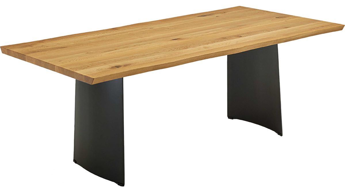 Seine Charaktereiche-Tischplatte mit Baumkante, die eine Tischplattenstärke von ca. 40 mm aufweist, wird von einem schwarz pulverbeschichteten Hohlwangen-Metallgestell getragen. Dadurch entsteht ein eindrucksvoller Materialmix, der sowohl schlichte als auch extravagante Facetten aufweist.