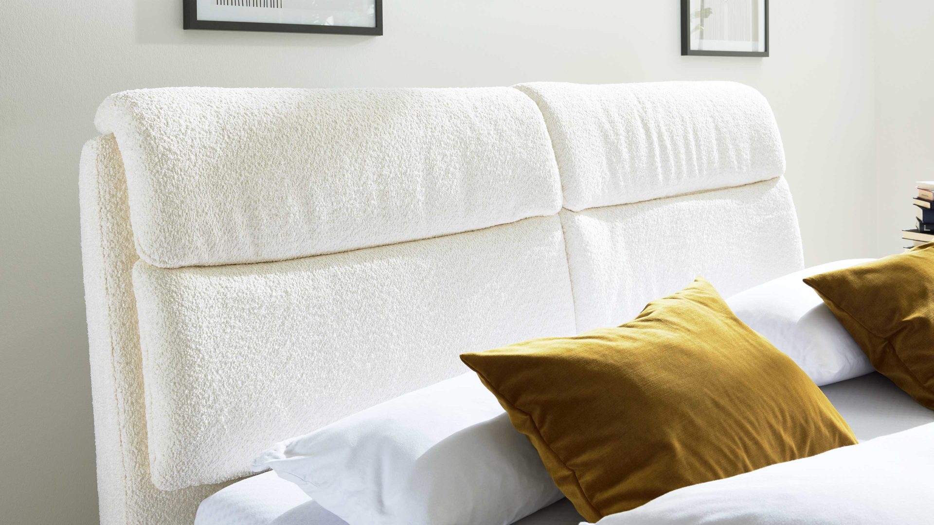 Ein echter Blickfang ist das bodenfreie Polsterkopfteil, das mit seiner filigranen Formgebung und der dezenten Kappnaht die elegante Linienführung des Bettes unterstreicht. Es dient nicht nur als ästhetisches Element, sondern auch als bequeme Rückenlehne – ideal zum Lesen, Entspannen oder Frühstücken im Bett. Auf Wunsch kann das Kopfteil mit einer Rückseite im Originalstoff bezogen werden, sodass es auch frei im Raum platziert werden kann.