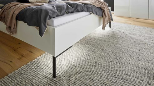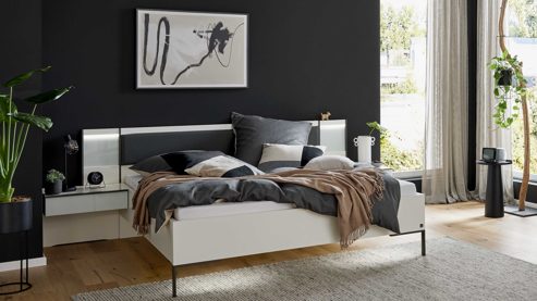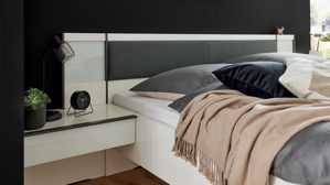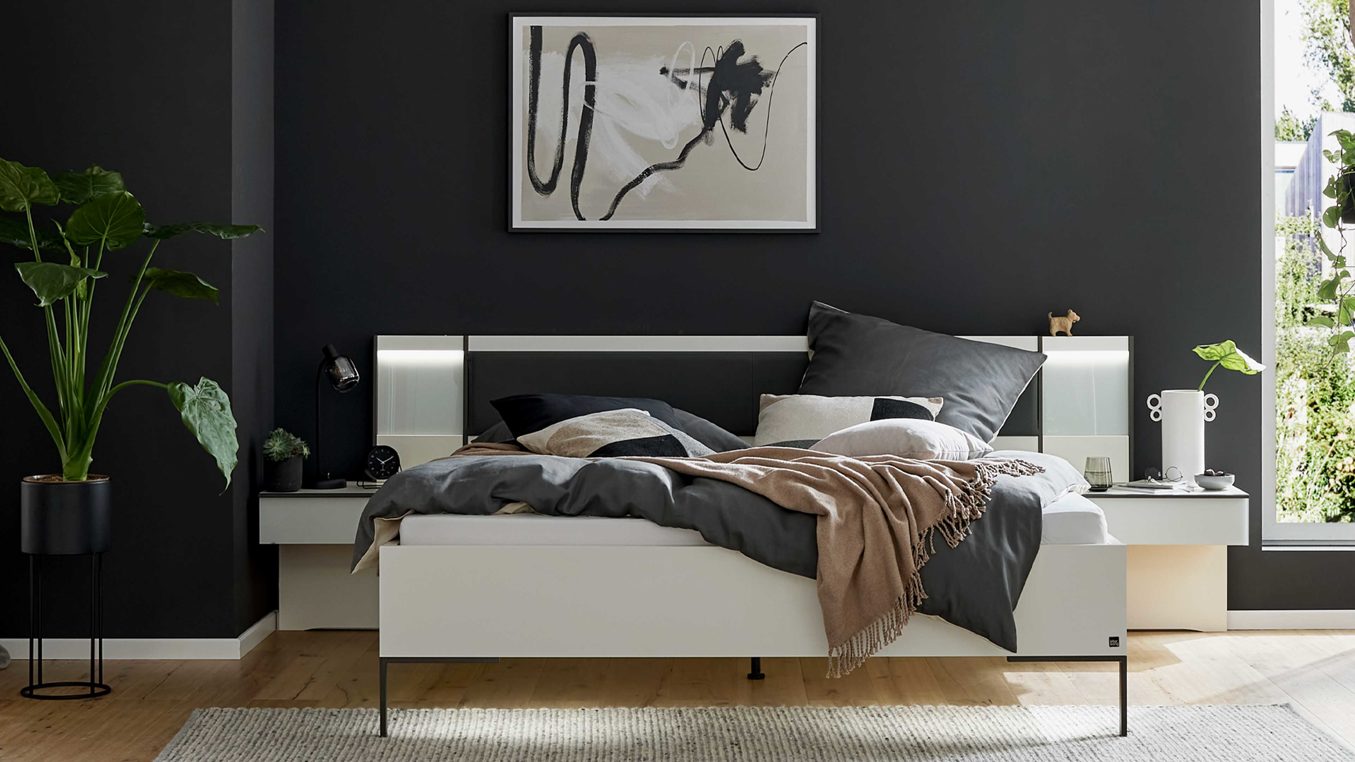 Zudem stehen Doppelbettgestelle in verschiedenen Breiten und Längen, zwei Fußvarianten (schmaler Winkelfuß oder Quersockel), Nachtkonsolen mit LED-Aufsatzpaneelen sowie fertig montierte Beimöbel für ein rundum harmonisches Schlafzimmer zur Verfügung.