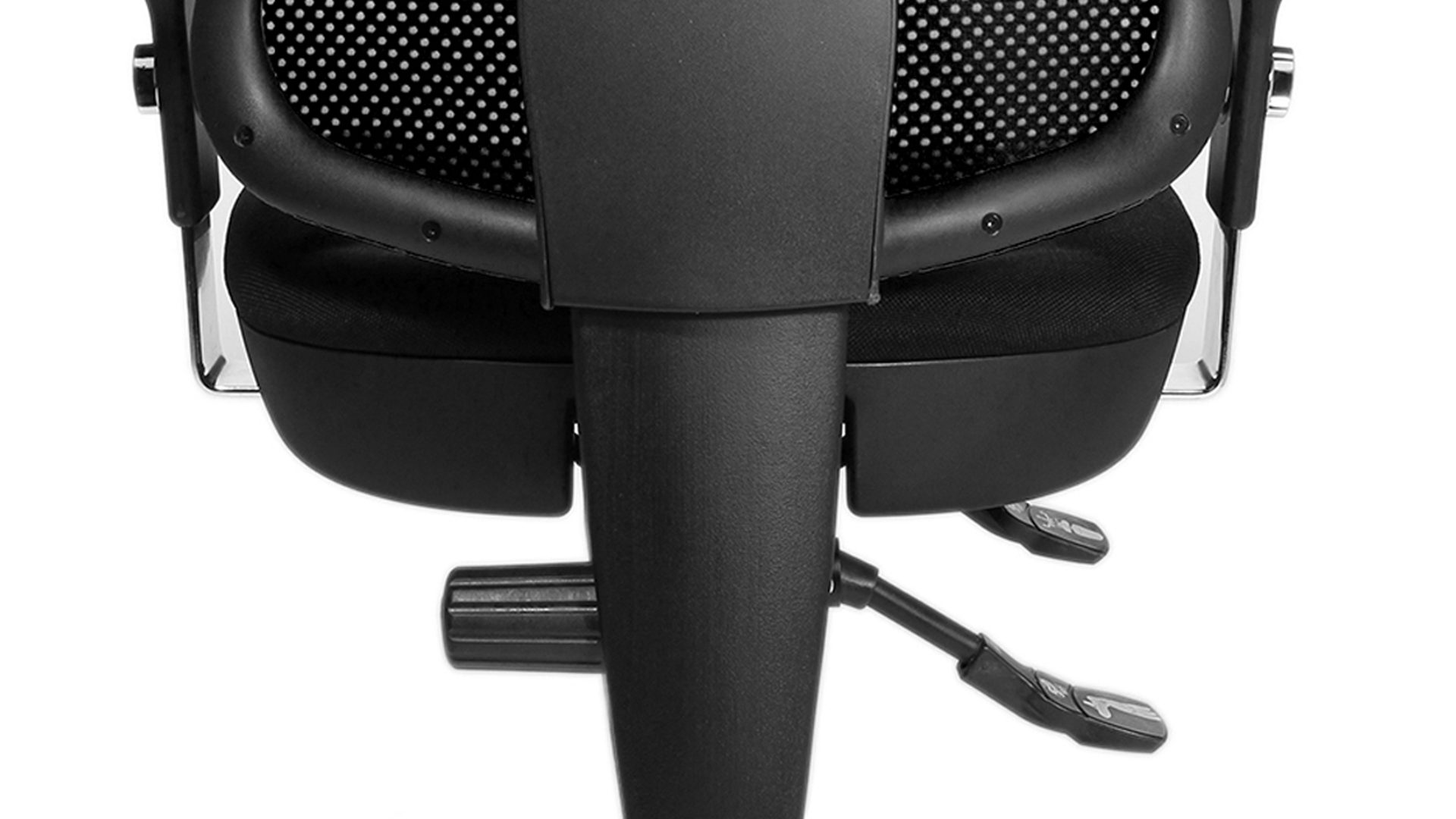 Über die Rastermechanik lässt sich die ergonomisch taillierte Rückenlehne mit integrierter Lendenwirbelstütze in der Höhe verstellen. Auch die Armlehnen sind höhenverstellbar.