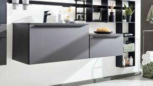 Alle Schubladen und Türen verfügen über Softclose-Technik mit Selbsteinzug, sodass alles leise und schonend schließt. Gleichzeitig handelt es sich um ein individuell planbares Badmöbelprogramm, mit dem du dein Bad passgenau und stilvoll gestalten kannst.