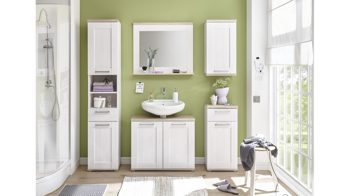 Charakteristisch sind die Fronten und Korpusse in weißer Eiche-Nachbildung. Sie verleihen den Badmöbeln eine zeitlos elegante Ausstrahlung. Für eine stilsichere Abrundung sorgen die matten alufarbenen Griffleisten. Die hochwertigen Melaminharzoberflächen erweisen sich als kratz- und stoßfest sowie pflegeleicht. Des Weiteren beeindrucken der Softeinzug der Schubladen und die Dämpfung der Türen. Beide Eigenschaften gewährleisten ein sanftes, leises Schließen.