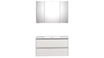 Charakteristisch sind die komplett verspiegelten Fronten und der Korpus in weißer Eiche-Nachbildung. Sie verleihen dem Badmöbel eine zeitlos elegante Ausstrahlung. Für eine stilsichere Abrundung sorgen die matten alufarbenen Griffleisten.