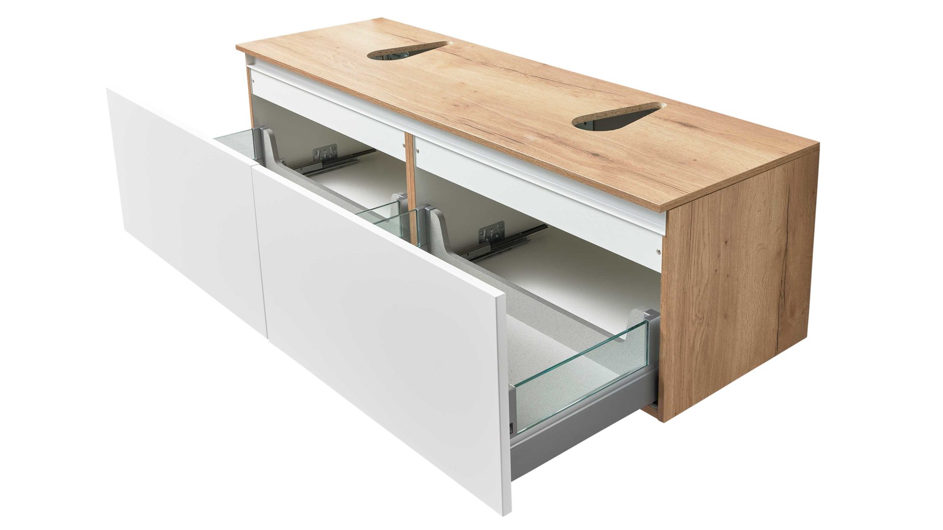 Das Set beinhaltet zwei Waschtischschränke (Typ 67447), die jeweils mit einer Innenblende, einem großzügigen Auszug und einer Holzrückwand ausgestattet sind. Maße pro Schrank: ca. 80 x 43 x 46 cm (B/LxHxT). Die Auszüge sind mit komforttablem Soft-Close und Selbsteinzug ausgestattet. Gegen Mehrpreis kannst du Glas-Seitenwände erhalten. Ergänzt werden sie durch zwei runde, weiße Keramik-Aufbauwaschtische (Typ 87732) mit Hahnlochbohrung und Überlauf. Maße: Durchmesser ca. 45 cm, Höhe ca. 15 cm.