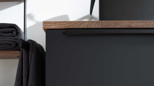 Die Interliving Bad Serie 7340 begeistert mit einem modernen, urbanen Look und durchdachten Funktionen. Die supermatte schwarze Lacklaminatfront mit schwarzem Relinggriff (Typ 7945) trifft auf einen mattschwarzen Korpus und eine elegante Vikings Oak Nachbildung – ein markanter Materialmix, der deinem Badezimmer Charakter und Tiefe verleiht.