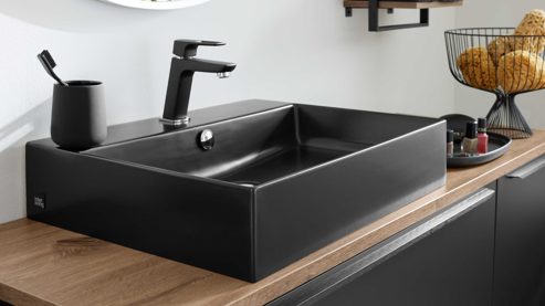 Dazu passt der mattschwarze Keramik-Aufsatzwaschtisch (Typ 87756), der durch seine edle, pflegeleichte Oberfläche und klare Formensprache besticht. Er ist mit einer Hahnlochbohrung und einem Überlauf ausgestattet und misst ca. 60 x 12 x 46 cm (B/LxHxT).