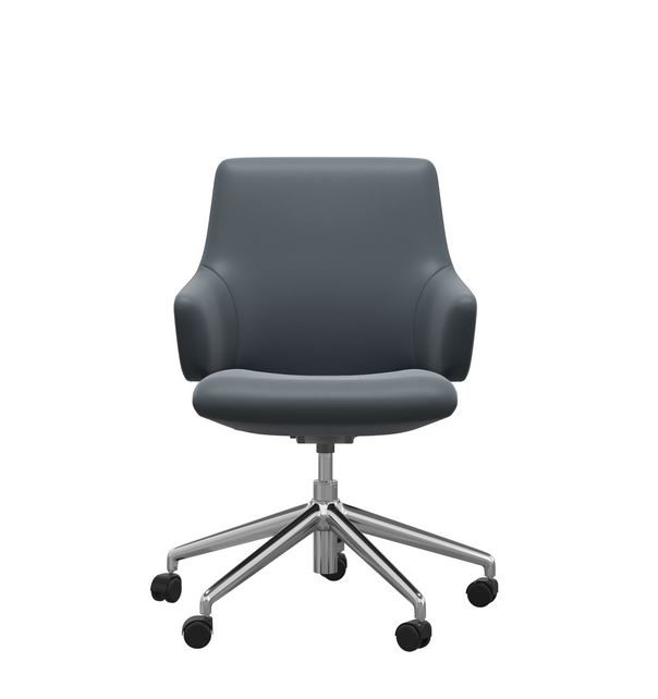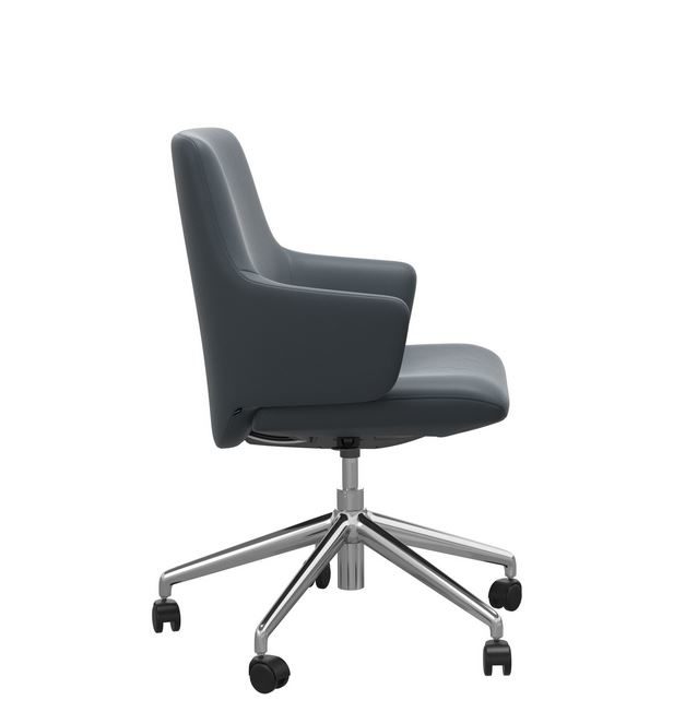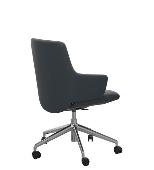 Die Abbildung zeigt den Home Office Sessel Laurel mit niedrigen Rücken in Leder Batick Atlantic Blue mit dem gestell in Chrom.